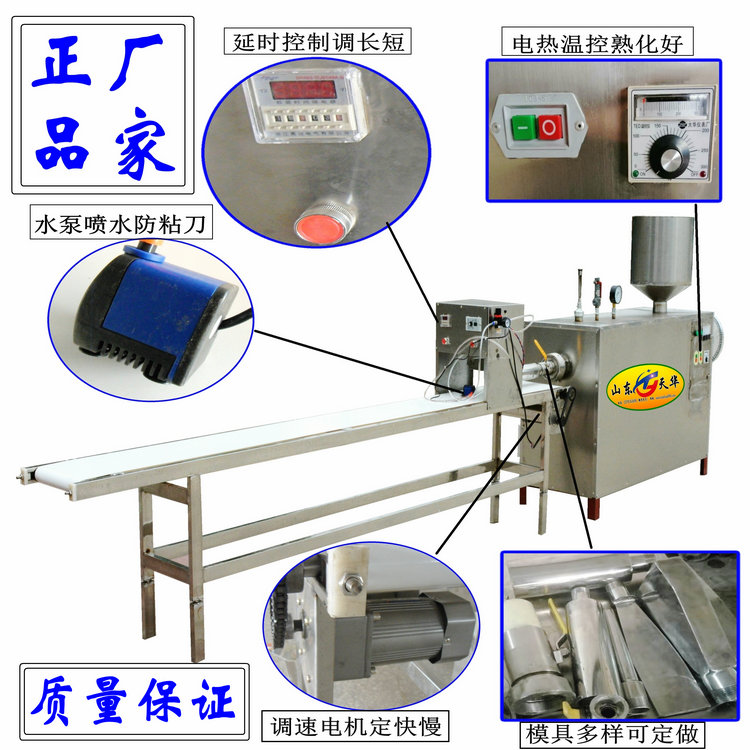 成套年糕机为机电一体化设计,由年糕熟化成型机和皮带输送数控切断机组成,操作简单,生产效率高,它采用电热温控水浴煮浆新工艺,以米浆为原料加工年糕,自动熟化,自动揉压匀质,自动成型,生产的年糕熟化彻底,外表光滑亮泽,口感筋道细腻,大小均匀,产品形状可根据用户要求,定制各种模具。