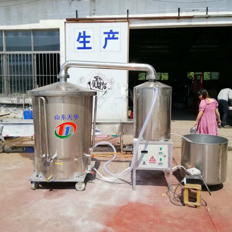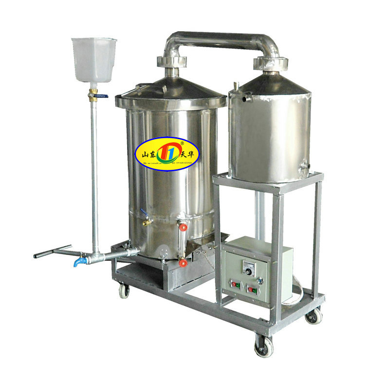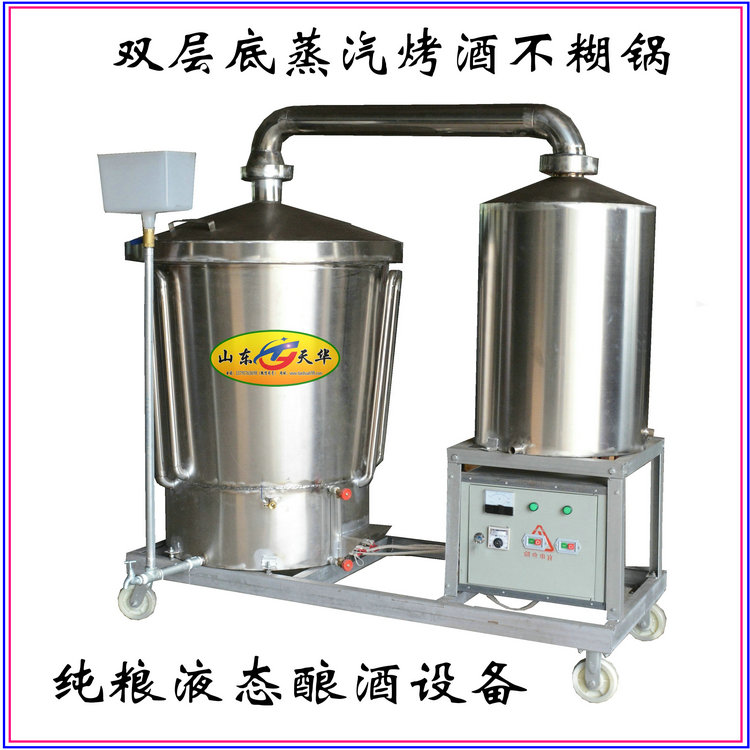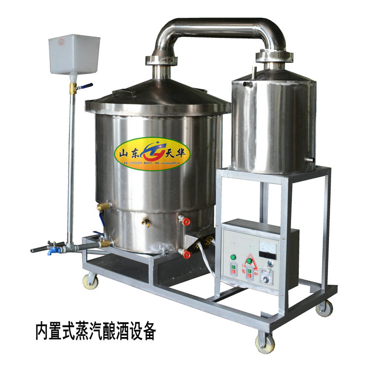 天华新型蒸汽式酿酒设备整机装在可四轮拉车上,移动、使用方便,安全可靠,以电加热或煤气加热蒸酒,操作简单,卫生环保,便于流动或上门蒸酒,是家庭,集贸市场、小型酒坊进行粮食酒蒸馏的理想设备,它的出现,使人们告别了勾兑酒,可以饮用健康放心的白酒,同时也提高了粮食转化收益。
